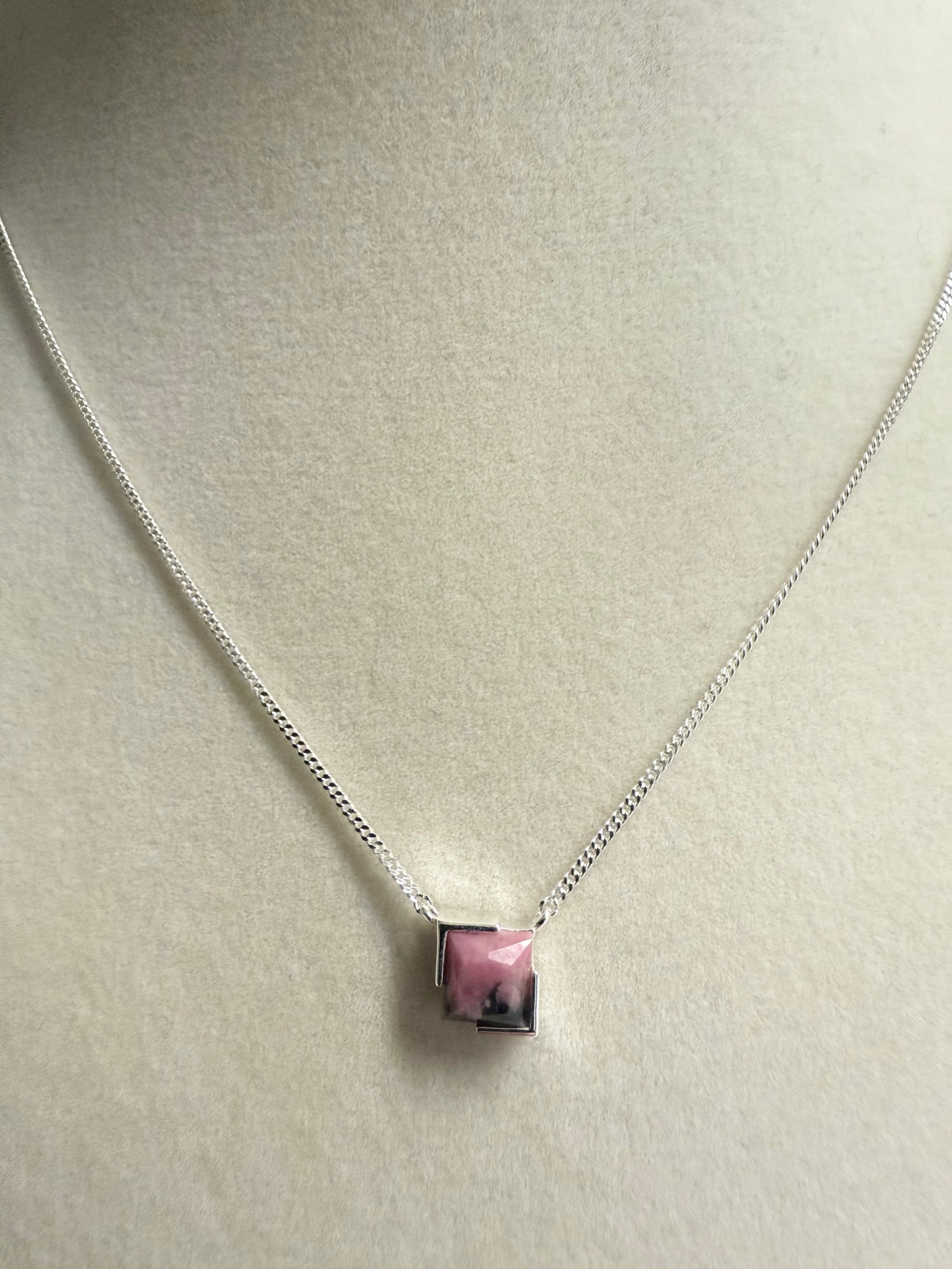 Necklace - 16" Chain w/ 2" extension. Sterling Silver. Rhodonite, square-shaped pendant.